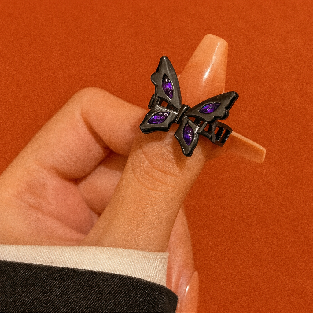 Bold. Elegant. Mysterious. The Midnight Bloom ring is made to turn heads with its deep black finish and sparkling purple crystal accents. Designed in the shape of a butterfly in full flight, this piece speaks of transformation, freedom, and unapologetic power.